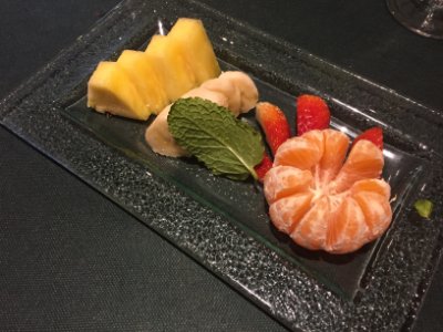 A la hora de pedir el postre, decidimos pedir fruta y la verdad es que cuando el camarero nos trajo el postre, mi cara fue de grata sorpresa. Yo particularmente cuando pido fruta, espero algo bastante común, lo normal, “lo que hace la media”, pero este no fue el caso. Con una presentación muy cuidada, donde se notaba el cariño, con un escandallo además perfecto para el hostelero, pero sobre todo donde se veía había una clara estrategia diferenciadora, que iba a hacer que la comida tuviera un broche de oro.