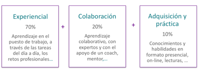 Me gustaría concluir este post, recordando que el desarrollo (aprendizaje) es normalmente la suma de varios factores en un porcentaje tal como 70% (experiencias,…) + 20% (cursos, mentores,…) + 10% (libros,….) según el siguiente esquema y recordando que: