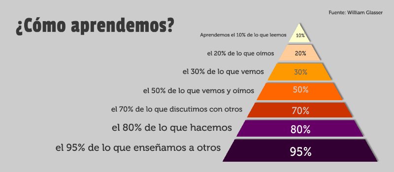 Sobre la base de esta introducción, me gustaría contaros cual fue mi experiencia con un compañero, durante el tiempo que dura una comida y todas las ideas, estrategias, conclusiones, conocimientos,…etc., que surgieron en cuarenta y cinco minutos aproximadamente. La experiencia así como la publicación de este post estarían en la base de la pirámide 80% (lo que hacemos) y el 95% (lo que enseñamos a otros), como nos recuerda William Glasser en “¿Cómo aprendemos?”.